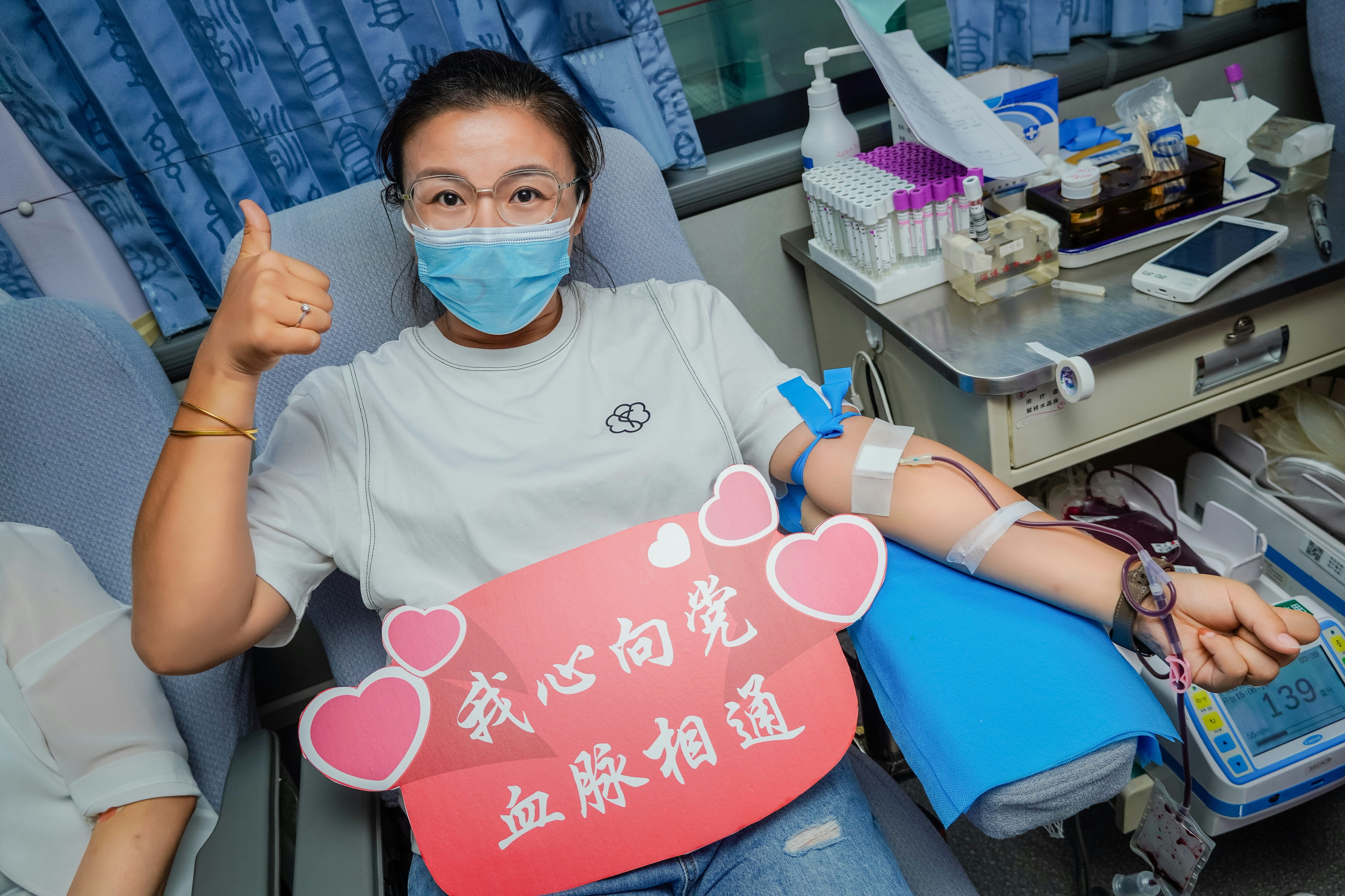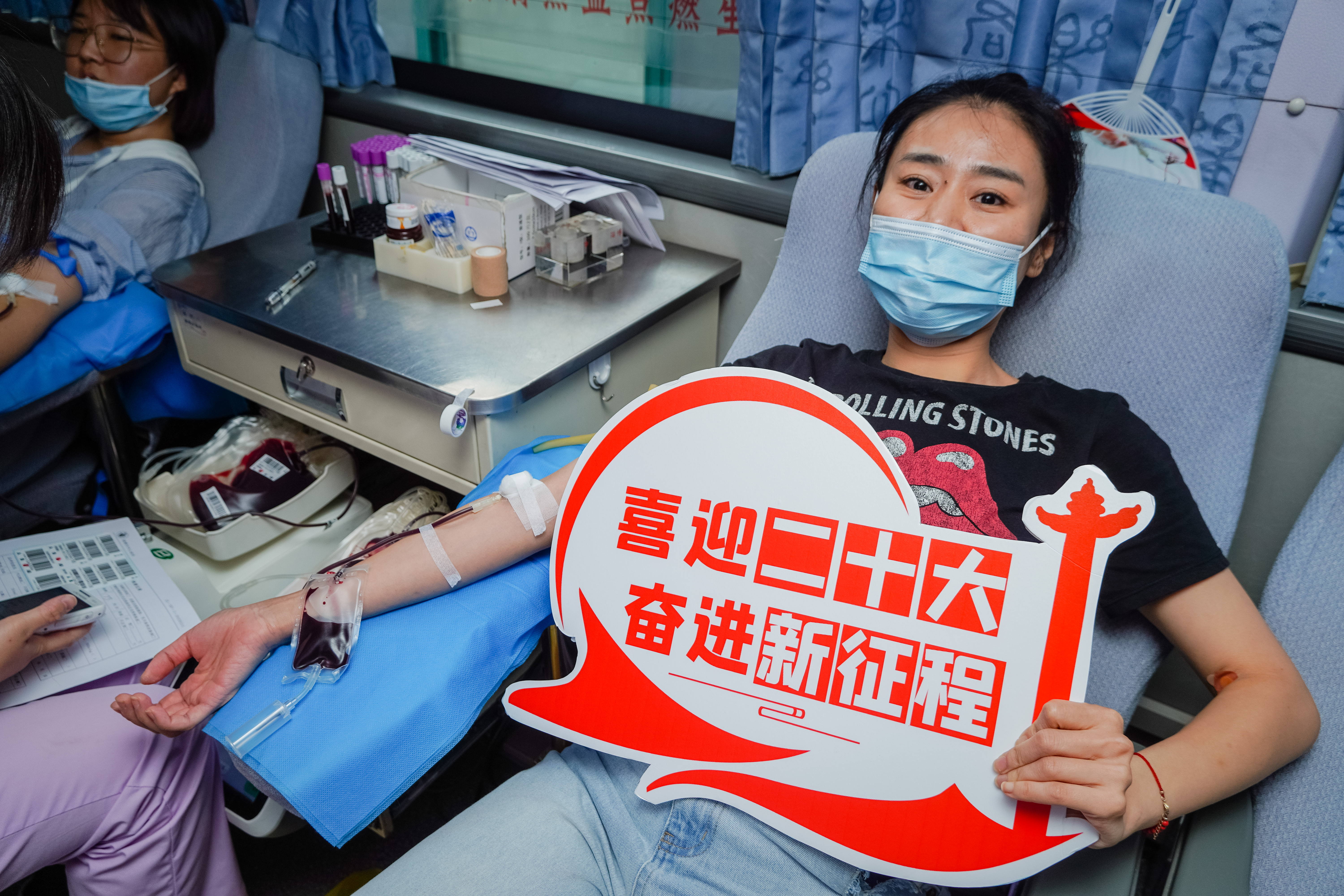 献血活动中,大家手举“喜迎二十大 奋进新征程”、“青春热血燃”、“我心向党 血脉相融”等无偿献血宣传标语,用实际行动传递无偿献血真情,为生命加油!献血的人很多,留下的照片很少,每一位参与者都是英雄!